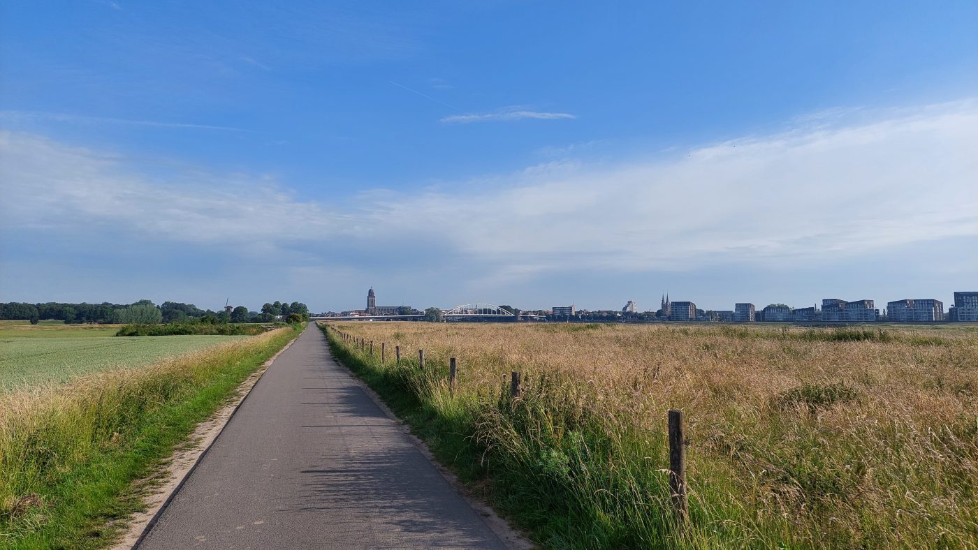 Na 40 km rijd ik de regio Deventer binnen en haalt Bas mij al in. Aangezien hij mijn live locatie had fietste hij alvast naar me toe. Na wat dwalen, draaien en keren bezoeken we samen het wielercafé De Meet in Deventer dat binnenkort officieel de deuren opent. We blijven net iets te lang hangen waarna we ons weer een (om)weg door Deventer banen.